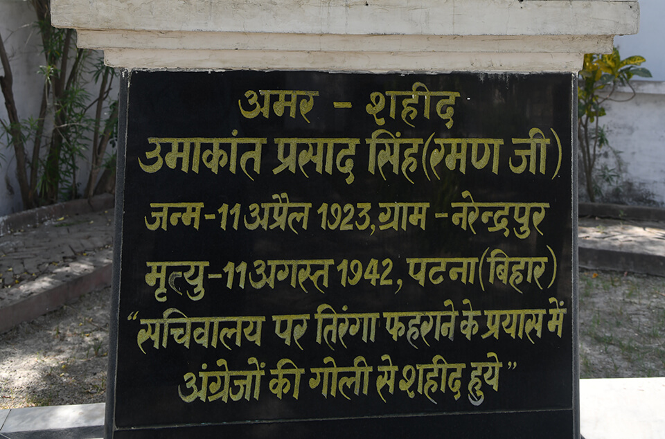 1942, भारत छोड़ो आंदोलन के दौरान अनेक छात्रों ने पटना सेक्रेटेरियट में आंदोलन किया और भारत का झण्डा फहराने की कोशिश की। उन्ही में थे उमाकांत सिंह नरेन्द्रपुर गाँव के अत्यंत विनीत छात्र। अँग्रेज़ों ने उनपर गोली दाग दी, जिसकी वजह से उन्होंने अपनी ज़िंदगी का बलिदान दिया। बिहार सरकार ने उन शहीद छात्रों की स्मृति का सम्मान करते हुए एक स्मारक का निर्माण किया है।